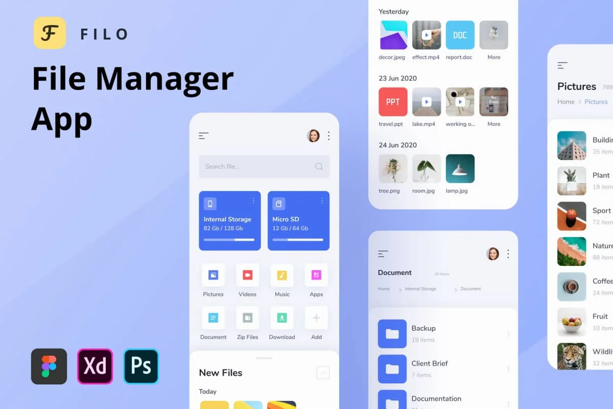 这是我们的新产品,称为Filo。 文件管理器应用程序有8个屏幕的应用程序概念。 由于矢量形状和组织良好的图层,因此易于编辑,自定义和调整大小。