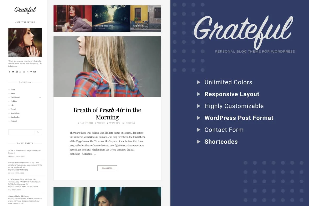 以感恩的时尚主题让您的内容脱颖而出。 感恩将带您的时尚博客再上一个台阶。 借助Grateful,我们旨在减少混乱,并为像您这样的时尚博客作者将其打造为一个光滑的两列主题。
